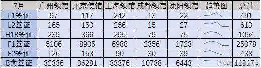 F1签证为学生签证,则是6月和7月最多,达到33136份和25078份,随后即迎来暑假。
