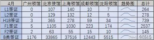 在2016财年的12个月内,来自中国大陆地区的申请中,共有10,763份L类签证获批。其中有5430份L1签证,有5333份L2签证。B1签证有380份,B2签证有1342份,B1/2签证有1,989,925份。F类签证有152,120份。