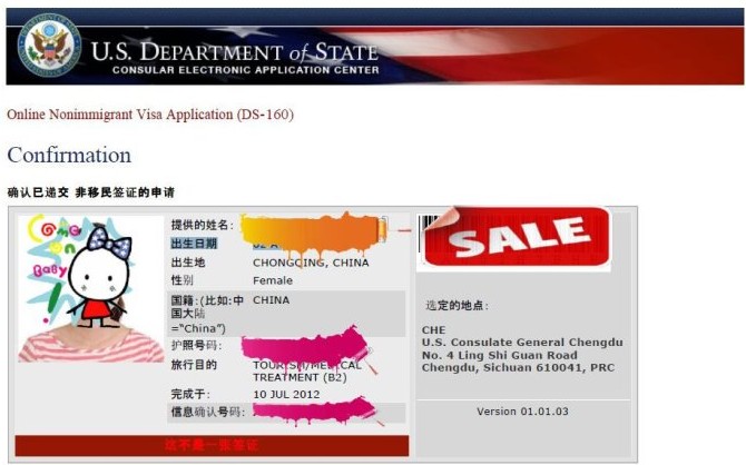 2.2英寸X2英寸正方形白色背景彩色正面照一张(没有该照片的电子版就不能完全完成DS160的确认,所以,最好在填写DS160时,有照片的电子档;也可以之后再拍了上传);上传照片后打印出DS160的确认单如下(去使馆面签时需要此确认单+彩照一张+中信银行代缴的签证费收据三联+护照一起交给美领馆):