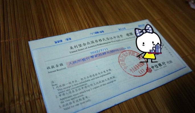 3.美利坚合众国非移民签证申请费收据:此收据需要到中信银行交钱购买,购买时要携带护照;若是帮别人代购需要对方护照的复印件,并在上面注明一切后果自负(银行工作人员会告诉的)。。目前的签证申请费是1024RMB,以前是900多,比德国都贵,加之美签拒签率高,所以很有可能就是“打水漂”的事儿。。