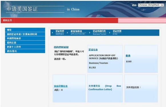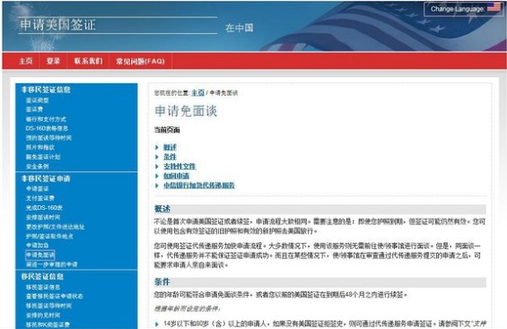 先登录美国国务院的网站,地址请戳:http://www.ustraveldocs.com/cn_zh/cn-niv-visarenew.asp。在左边的“非移民签证申请“栏里找到”申请免面谈“选项(请查看如下图片粉色框),便会出来如下的页面:。不会英文的同学,可以将右上角的语言设置成中文。