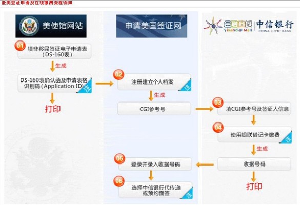 因为考虑到当时护照不在身边无法去中信银行营业厅办理手续,就选择了在线支付。去营业厅支付的同学要打印相应的“美国签证收费单”,然后才能去付款。